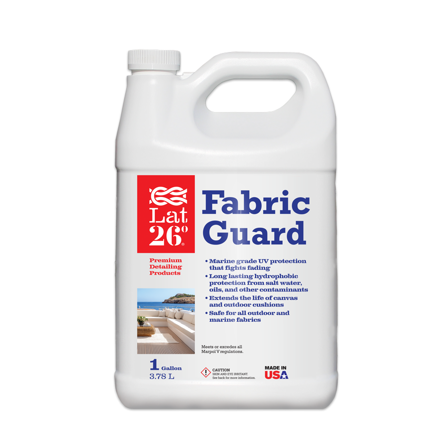 Lat 26˚ Fabric Guard is a durable water, oil, and UV-repellent protective coating. Its formula adheres to fabric fibers, preventing stains, mold, and fading while ensuring breathability. Its long-lasting protection provides continuous defense against the elements, safeguarding various exterior cushions and fabrics throughout the seasons. Notably, Lat 26˚ Fabric Guard is effective in re-waterproofing clothing, including foul weather gear and rain jackets.